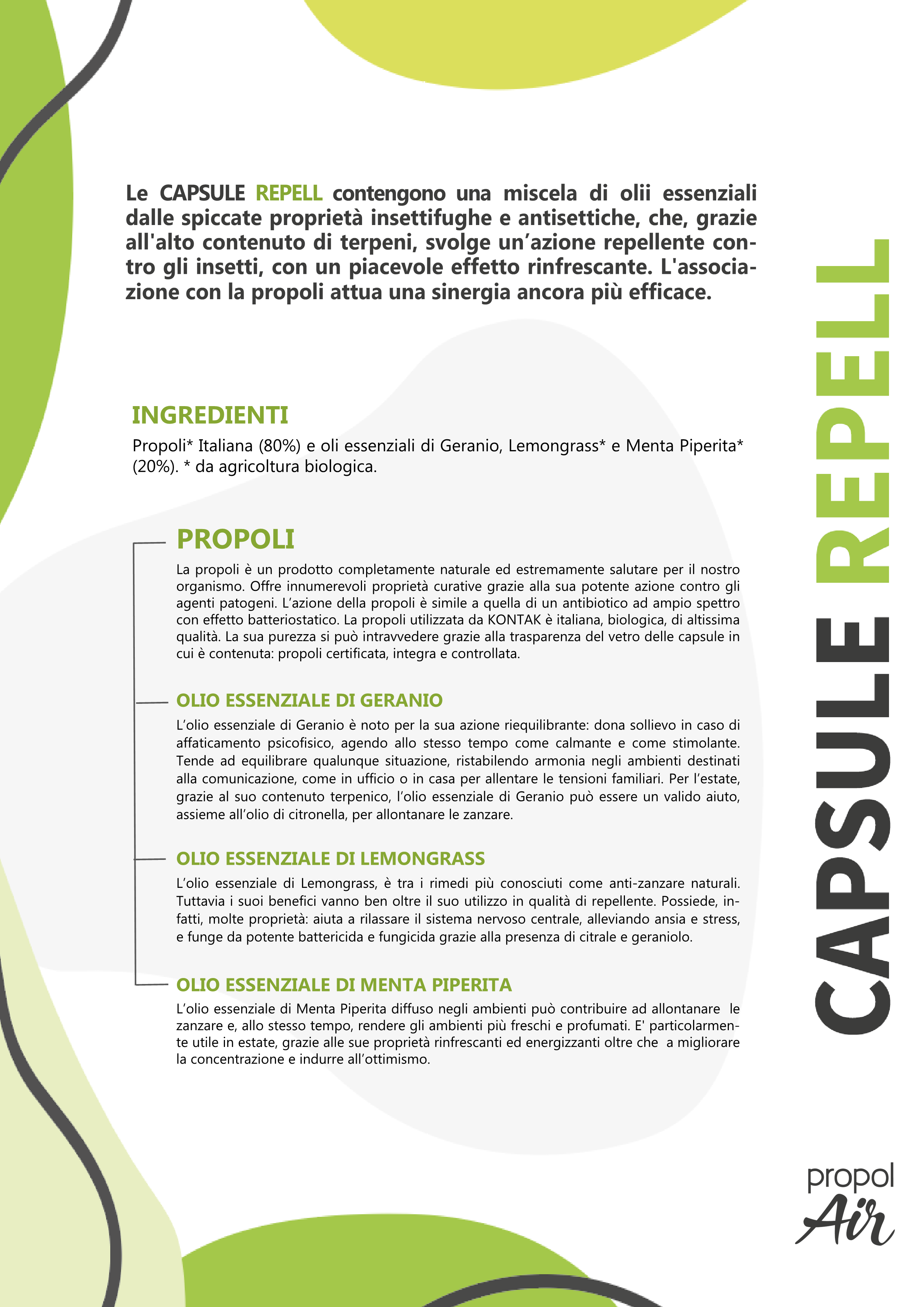 Grazie alle loro proprietà insettifughe e antisettiche, dato l'alto contenuto di terpeni, gli oli essenziali contenuti nelle CAPSULE REPELL svolgono un'azione repellente contro gli insetti, con un piacevole effetto rinfrescante. L'associazione con la propoli attua una sinergia ancora più efficace.
