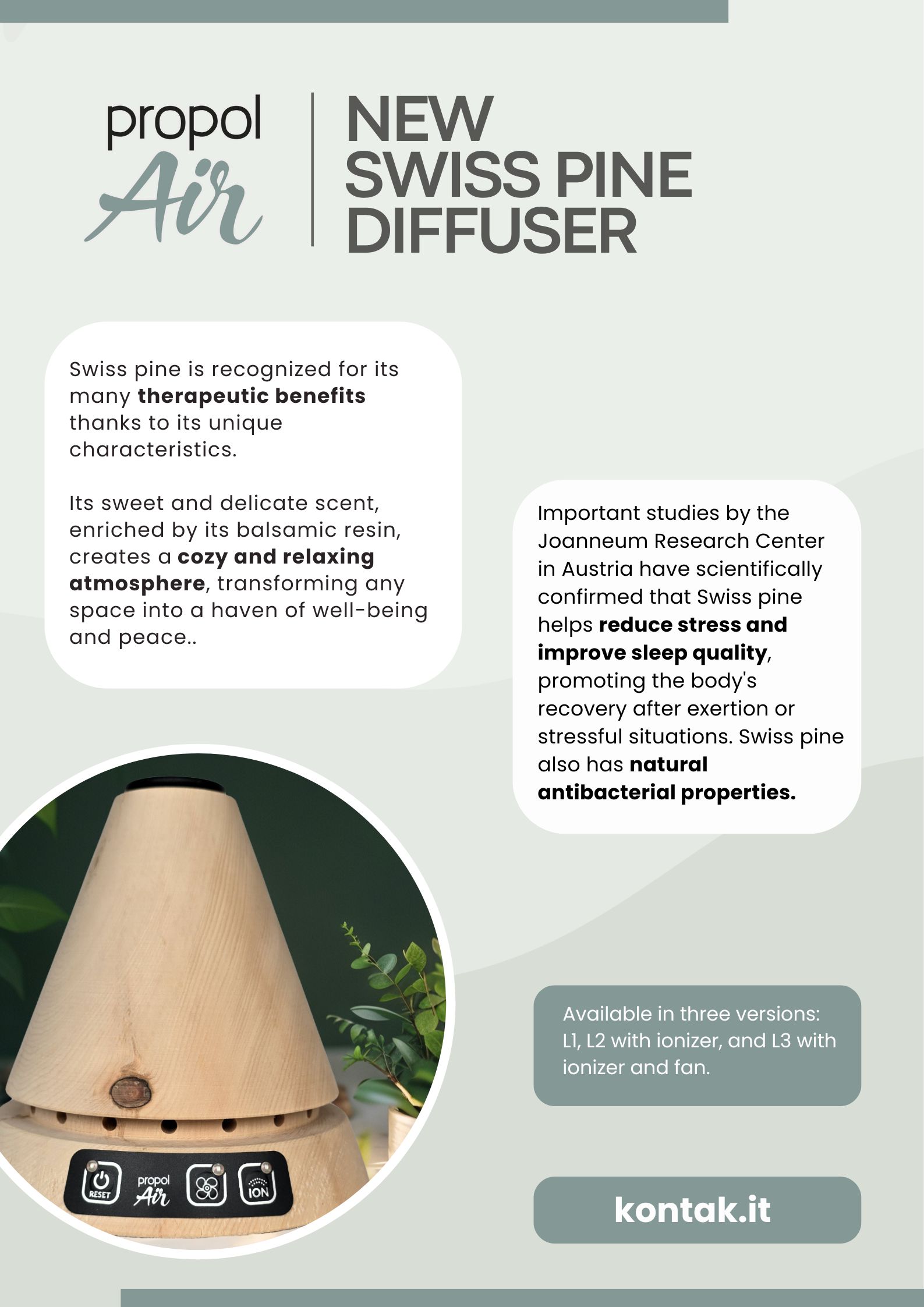 L3 wooden model is equipped with Ionizer and a Fan, which doubles the range of action of the ionized propolis up to saturate rooms of 60 m². It is advisable to use it during the day, as the fan could disturb sleep in subjects sensitive to noise. The diffuser uses exclusively KONTAK propolis capsules.